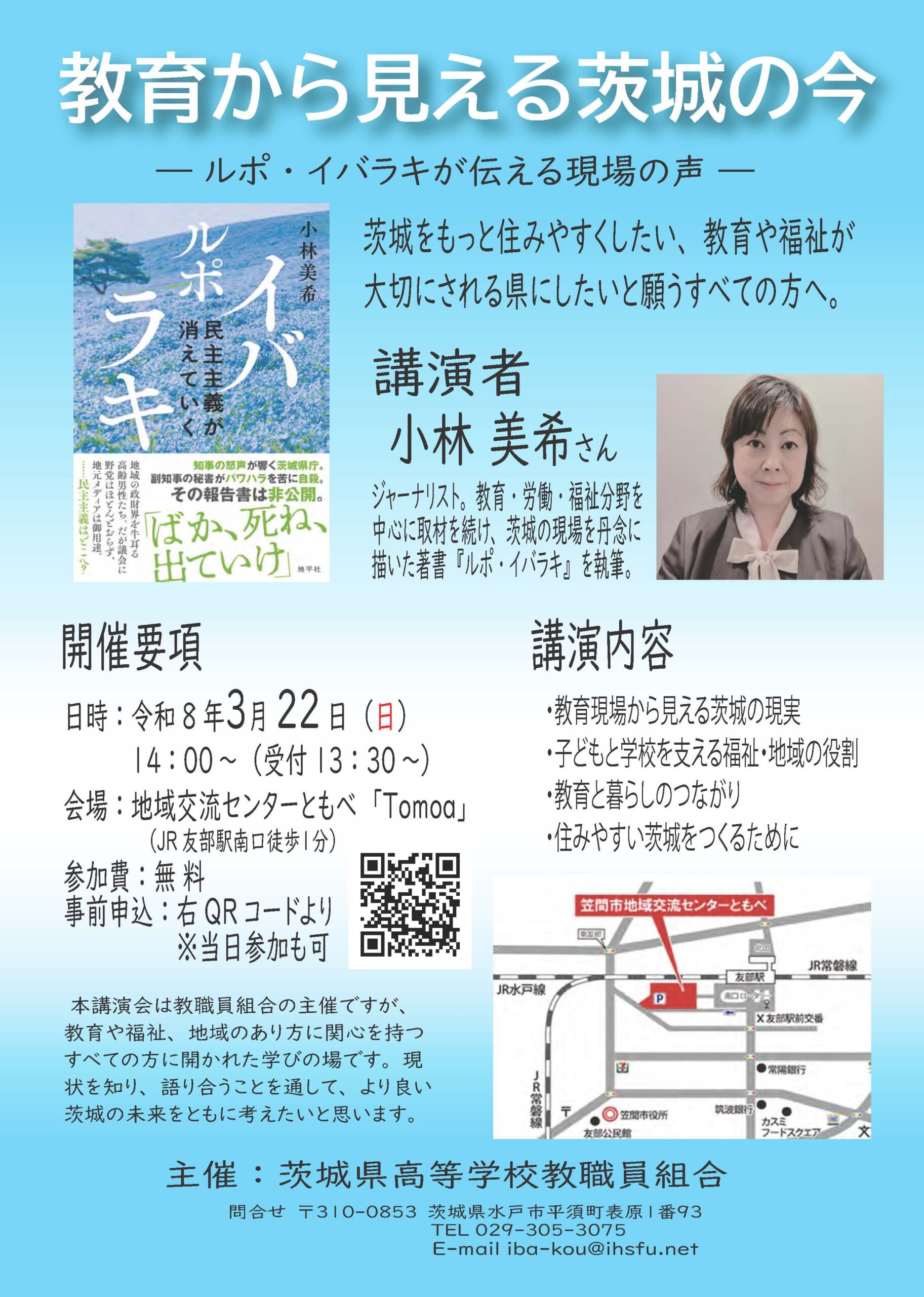 茨城県高等学校教職員組合は、県内の県立高等学校・障害児学校の教職員で組織され、教職員の生活や権利を守り、子どもたちの発達と成長を保障するため、教育の民主化と教育条件の向上を目指して活動しています。
